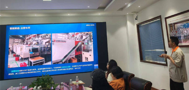 嘉善三思光電技術(shù)有限公司技術(shù)經(jīng)理楊順興(右一)介紹企業(yè)技術(shù)情況 (曾慶華 攝)
