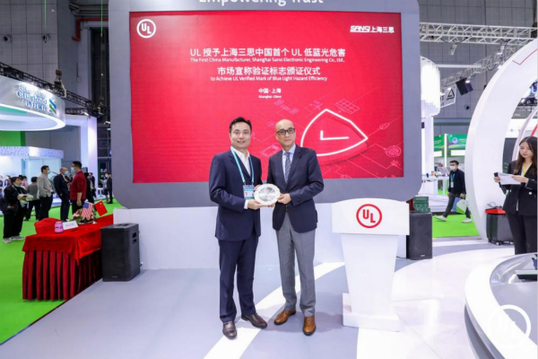 全球著名的安全性標準起草、制訂的第三方機構——UL公司也亮相這一全球盛會,并在此期間(11月6日下午)向上海三思電子工程有限公司(以下簡稱上海三思)頒發了中國首個UL低藍光危害驗證標志證書。