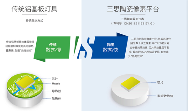 與傳統的鋁基板植物生長燈相比較,三思植物生長燈采用自主研發的陶瓷像素散熱技術,散熱快,大大降低了芯片結溫,降低光衰,延長了燈具壽命,同時陶瓷材料在耐溫、防腐、抗壓等方面更勝一籌。