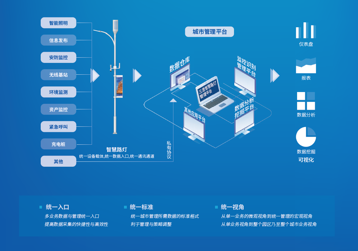 城市的精細化管理需要大量的數據依托,智慧路燈及燈桿系統利用其分布在城市各個道路的密集型特點,可以實時收集和發布各項城市信息。通過對于數據及信息的收集和分析,為城市精細化管理提供重要的數據支撐,給城市建設者,管理者提供大量實效信息。