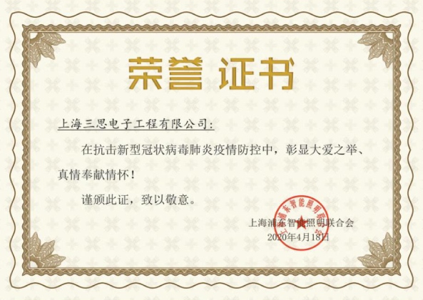 4月18日晚,上海浦東智能照明聯合會通過云直播形式,由會長李志君向上海三思電子工程有限公司等多家會長單位頒發榮譽證書,以表彰企業在抗擊新型冠狀病毒肺炎疫情防控中,為抗疫捐款捐物,彰顯大愛之舉;眾志成城,打贏抗擊疫情防疫戰。