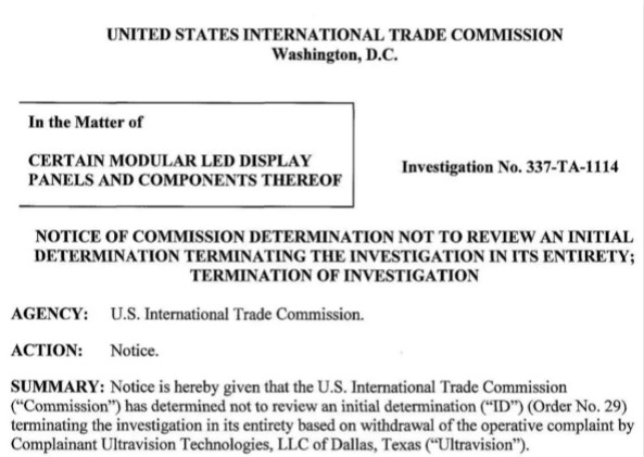 美國時間2月21日,美國國際貿(mào)易委員會(ITC)正式下達決定:不復議ITC法官的初步裁決,始于2018年3月27日美國公司針對中國LED顯示屏企業(yè)發(fā)起的專利侵權(quán)案,原告現(xiàn)無條件撤訴!令人關(guān)注的LED顯示屏337案件正式結(jié)束調(diào)查。
