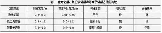 ③材料經(jīng)過激光切割后,熱影響區(qū)寬度很小,切縫附近材料的性能也幾乎不受影響,并且工件變形小,切割精度高,切縫的幾何形狀好,切縫橫截面形狀呈現(xiàn)較為規(guī)則的長方形。激光切割、氧乙炔切割和等離子切割方法的比較見表1,切割材料為6.2mm厚的低碳鋼板。