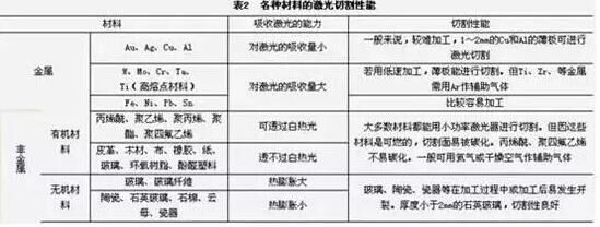 金屬基復(fù)合材料、皮革、木材及纖維等。但是對于不同的材料,由于自身的熱物理性能及對激光的吸收率不同,表現(xiàn)出不同的激光切割適應(yīng)性。采用CO2激光器,各種材料的激光切割性能見表2。